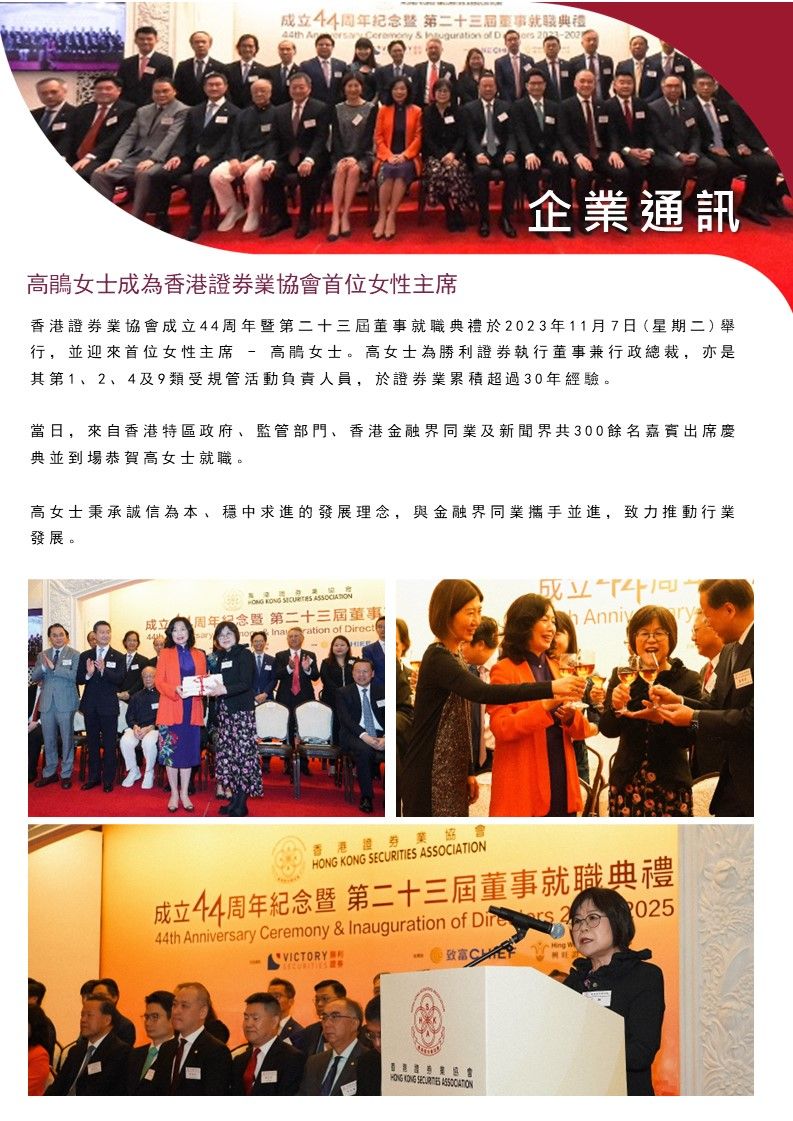 【勝利證券】高鵑女士成為香港證券業協會首位女性主席
