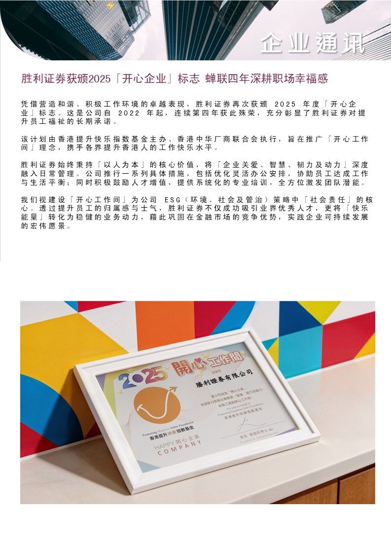 【胜利证券】获颁2025「开心企业」标志 蝉联四年深耕职场幸福感
